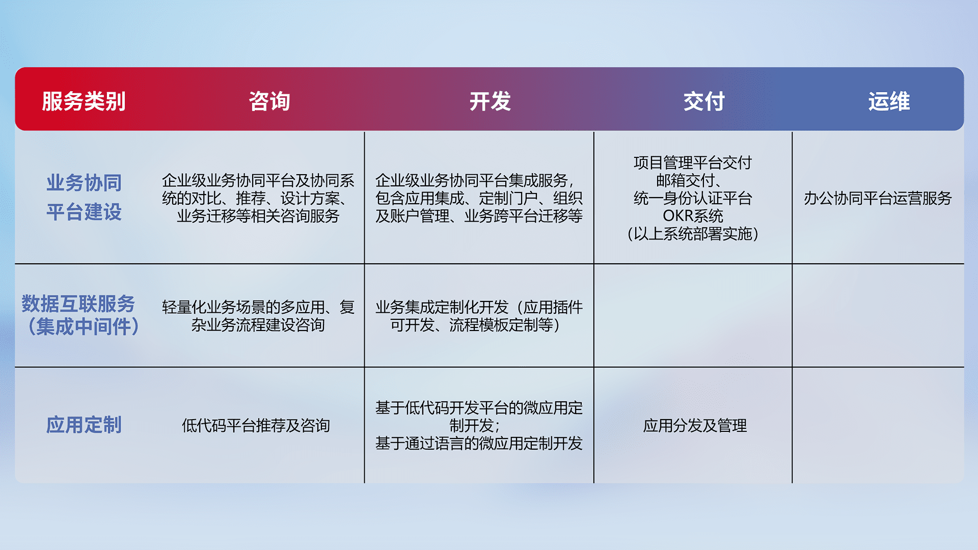 针对钉钉、、、、企微、、IDaas等平台级产品提供产品的规划、、、方案、、、、交付、、、定制化开发等服务,,实现如统一协同办公、、智能客户服务、、混合会议管理、、、、智能数据查询、、、等业务场景,,实现数字化转型。。